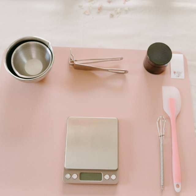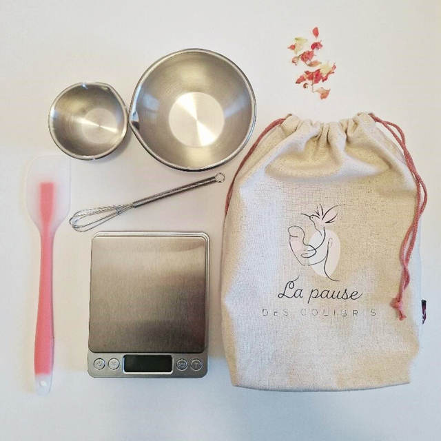 Ce kit inclut une balance de précision (au 0.01g), un bol de 200 ml, un mini bol de 50 ml, un mini fouet cosmétique et une spatule souple, le tout emballé dans une jolie pochette en tissu certifiée Oeko-Tex, fabriquée en Alsace (Waltenheim, 68).
